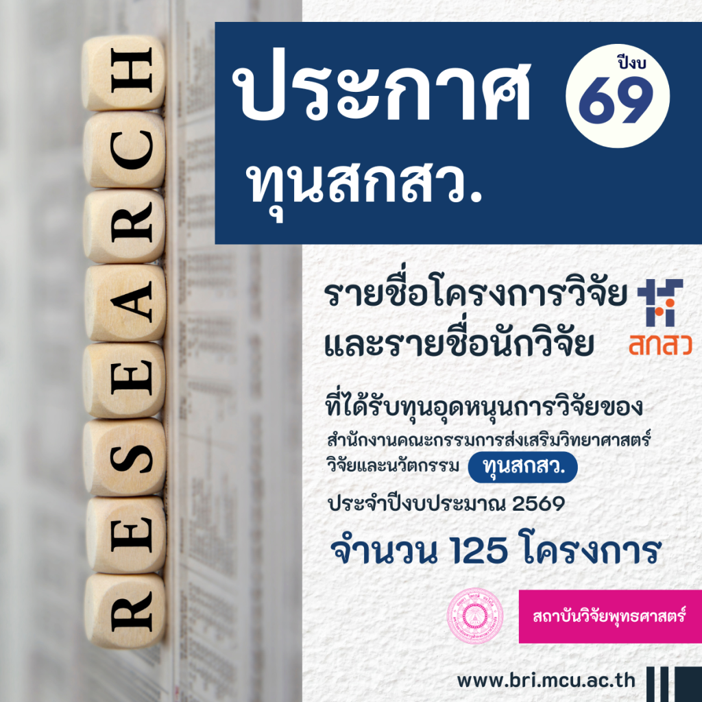 Uncategorized ประกาศรายชื่อโครงการวิจัยและนักวิจัยที่ได้รับทุนอุดหนุนการวิจัย (ทุนสกสว.) ประจำปีงบประมาณ 2569 Manasapon Yangtalay October 4, 2025 ประกาศโครงการวิจัยและนักวิจัยที่ได้รับทุนอุดหนุนการวิจัย-FF69-1Download Continue Reading Previous: ขอน้อมถวายมุฑิตาจิตยินดีกับผู้ได้รับแต่งตั้งเป็นผู้บริหาร วิทยาเขตนครราชสีมา จำนวน 5 รูป/ท่าน Leave a Reply Cancel replyYour email address will not be published. Required fields are marked *Comment * Name * Email * Website Save my name, email, and website in this browser for the next time I comment. Δ Related Stories Uncategorized ขอน้อมถวายมุฑิตาจิตยินดีกับผู้ได้รับแต่งตั้งเป็นผู้บริหาร วิทยาเขตนครราชสีมา จำนวน 5 รูป/ท่าน Manasapon Yangtalay October 4, 2025 Uncategorized แจ้งนักวิจัย ที่ได้รับทุน FF69 เข้าร่วม Work Shop ประเมินรายงานโครงการวิจัยความก้าวหน้าและทำสัญญาวิจัย Manasapon Yangtalay October 4, 2025 Uncategorized ทำเนียบผู้ดำรงตำแหน่งทางวิชาการ มจร. วิทยาเขตนคราชสีมา 2568 Manasapon Yangtalay September 16, 2025